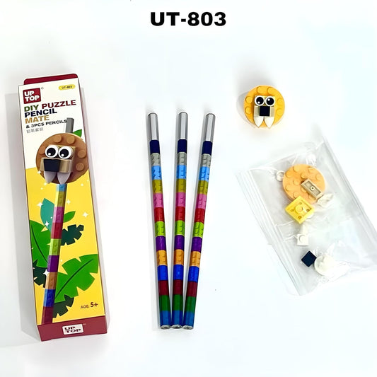 1 BLOCK SET & 3PCS OF PENCIL Lion DIY Lego Puzzle Pencil Mate for kids Pencil Set for kids Birthday Return Gifts School Stationery Set For boys|Girls (Pack of 3, Multicolor)