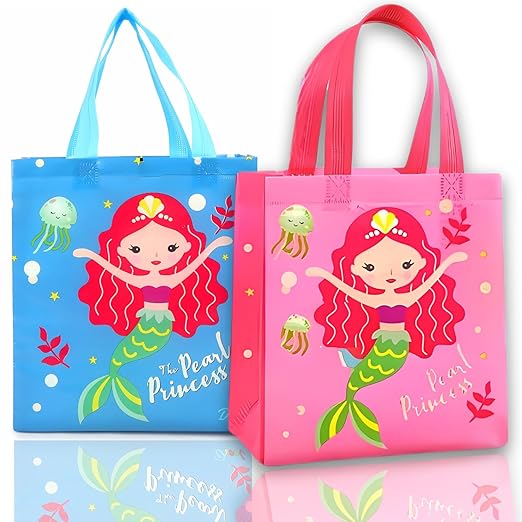 Mermaid Theme Return Gift Bags (Pack of 10) - Reusable Canvas Goodie Bags for Kids Birthday, Sturdy Multi-Purpose Gift Bags for Girl Theme, Perfect Party Favor Gifts and Treat Bags
