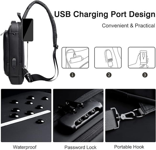 Waterproof Polyester Sling Bag for Men & Women Anti-Theft Crossbody Chest Backpack with USB Charging Port Lightweight Shoulder Travel Bag PACK for Hiking, Work, Gym & Outdoor Use.